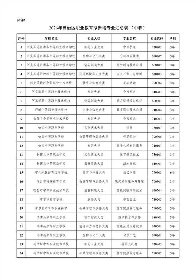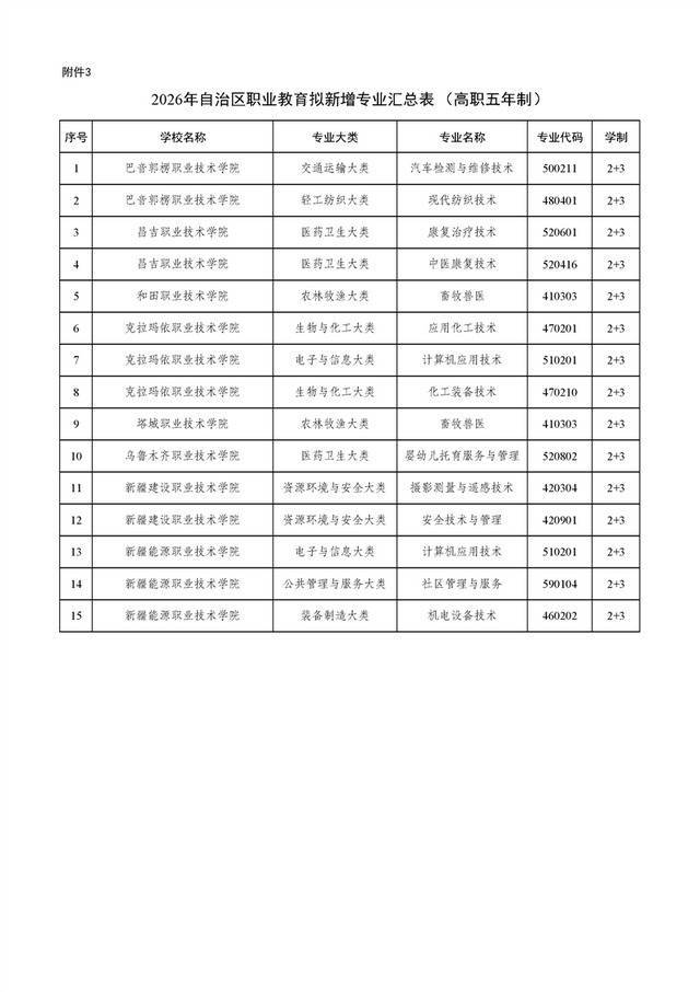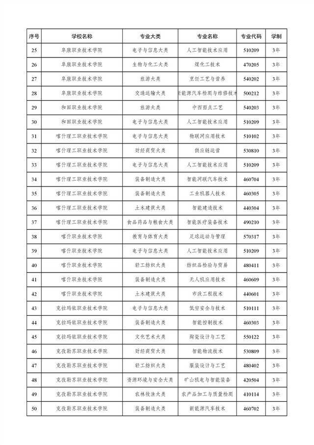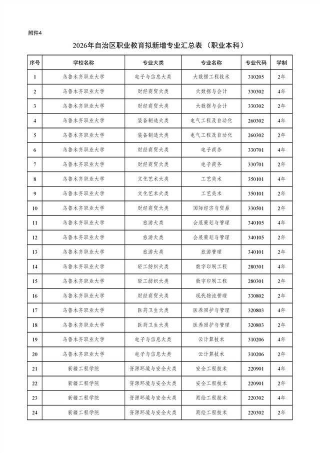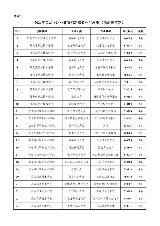 2025年12月,陶冶部发布《2025年做事陶冶专科目次增补清单》(以下简称为《清单》),共增设了57个新专科,其中,中职专科3个、高职专科专科31个、做事本科专科23个。在新疆拟新增的274个专科中,阿勒泰做事手艺学院、克拉玛依做事手艺学院、新疆天山做事手艺大学、伊利做事手艺学院开设了《清单》中增补的新专科。