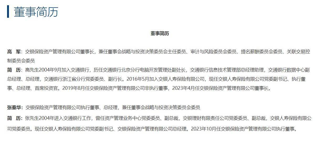 另一位党委副文牍高军,自2021年起担任交银东说念主寿总司理。他雷同于2004年加入交通银行,早期恒久在交通银行信息时期科罚部及数据中心职责,后转任浙江省分行副行长积聚业务科罚磨真金不怕火。2016年插足交银东说念主寿后,他历任副总司理、首席风险官等职,于2021年升任总司理,并于2023年起兼任首席投资官,同期担任交银保障资管董事长。